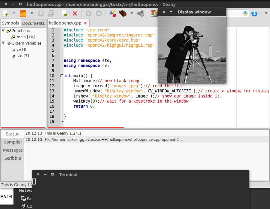 Buatlah sebuah fail cpp dan siapkan suatu citra di dalam direktori tersebut. Masukkan kodingan berikut di dalam fail cpp yang sudah kalian buat menggunakan Geany.