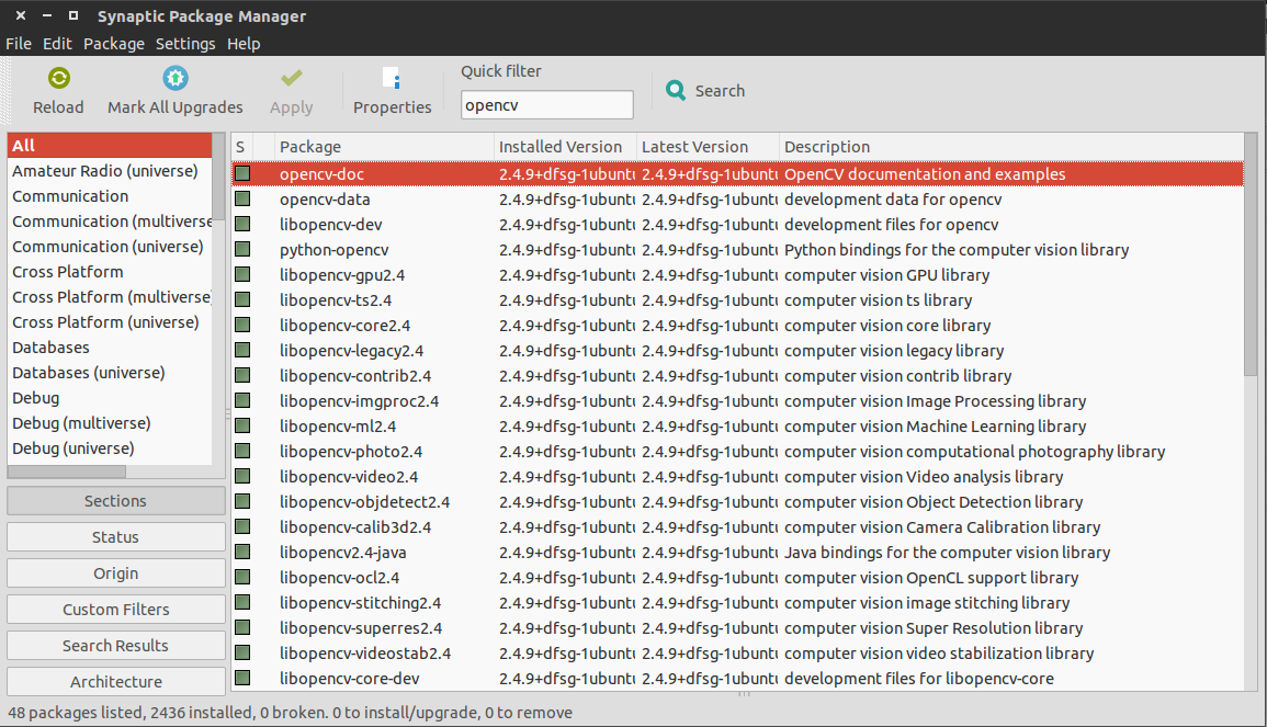Repository Ubuntu sudah menyediakan beberapa library OpenCV yang bisa digunakan untuk melakukan operasi-operasi pemrosesan citra digital. Coba kalian buka Synaptic package manager (kalau belum ada, silahkan install melalui ubuntu software center) dan cari opencv. Install-lah package-package yang ditemukan.